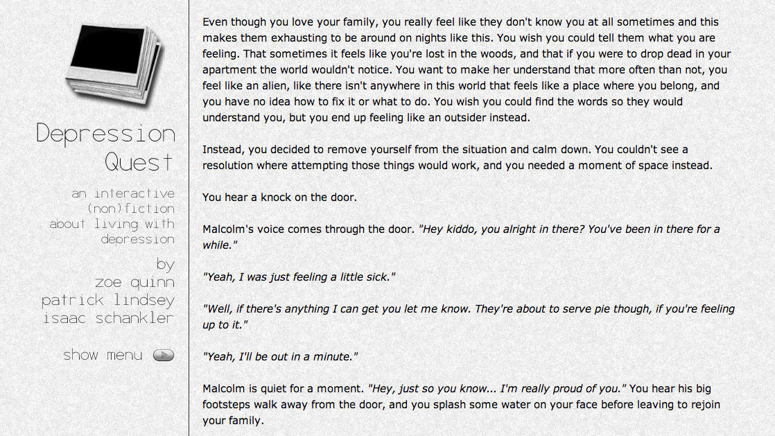Depression Quest tiene el dudoso honor de ser el título que inició la polémica del #GamerGate, pero eso no tiene que ver con este reportaje. El título no es extraño por su jugabilidad, sino por el tema que trata. Intenta situarnos en la vida de una persona con depresión, intentando gestionar los eventos del día a día, basado en las propias experiencias de su creadora, Zoe Quinn.