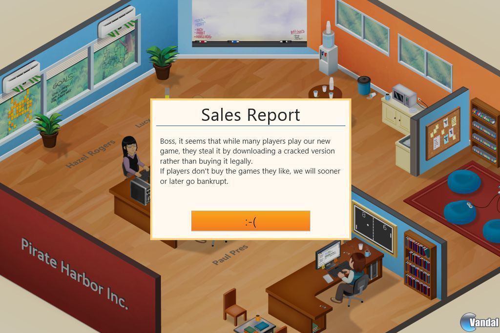 En Game Dev Tycoon podemos fundar nuestro propio estudio e intentar, desde nuestro garaje, ir evolucionando para convertirnos en un gigante de la industria. La medida consistía en que en un momento dado los juegos que el estudio virtual desarrolla alcanzan niveles altos de piratería, lo que a la larga hacía inviable la economía de esta simulación y por tanto, supone su cierre. Así, los piratas no tardaron en comentar en internet cómo sus esfuerzos eran inútiles y cómo la piratería virtual arruinaba sus estudios virtuales. Irónicamente, lo que ellos estaban haciendo en la vida real.