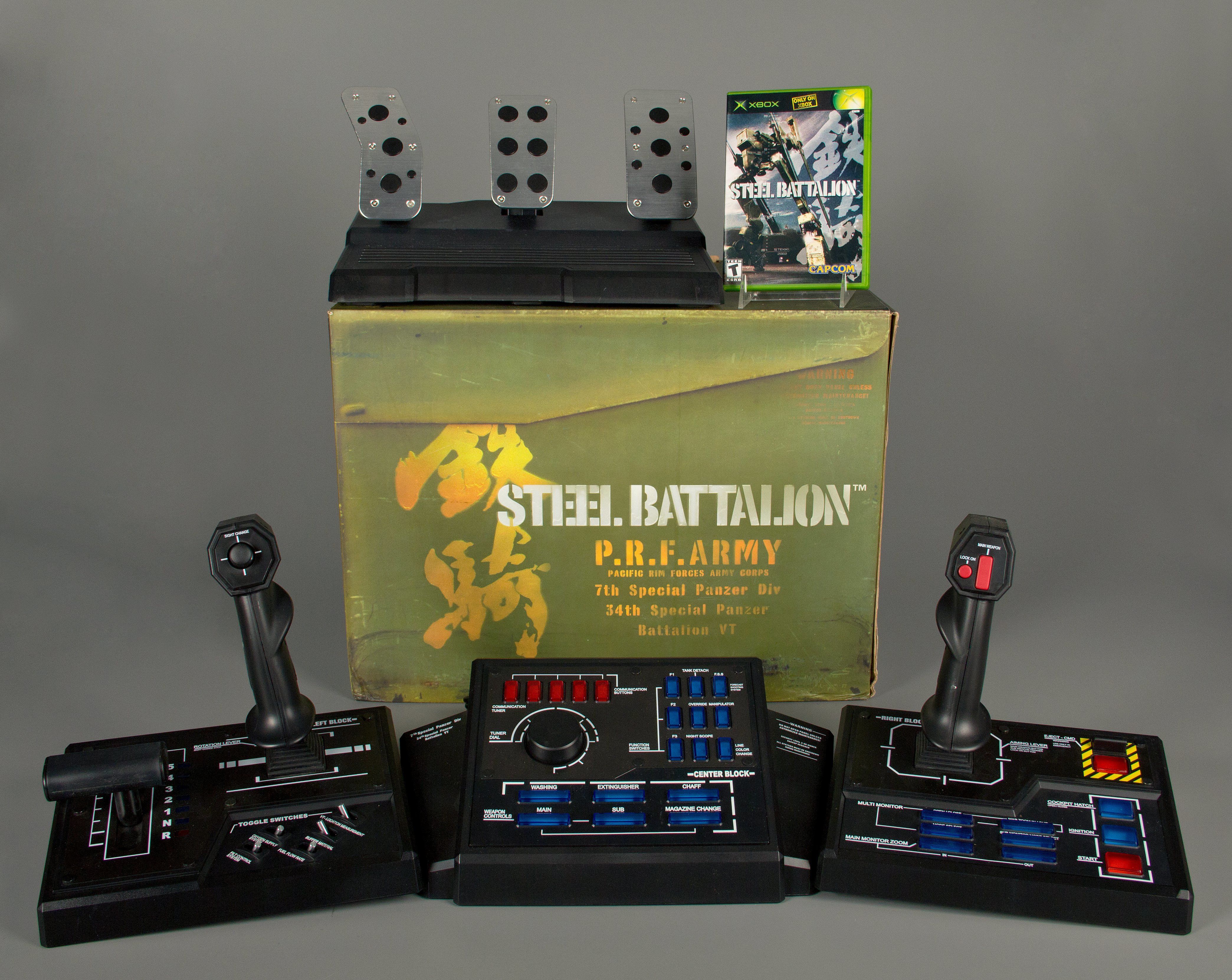 Steel Battalion nos ofrecía un panel de mandos de mecha, con más de 30 botones, palancas y pedales, que utilizaríamos para simular el control del robot de turno. Queremos destacar lo de simular, ya que tendríamos que arrancar el VT antes de cada partida, evitar que se sobrecalentase, o incluso tener cuidado de no coger una curva muy rápido para evitar que el robot cayese de lado al suelo. Sin duda, una apuesta arriesgada que se convirtió en una de las exclusivas más originales de la consola de Microsoft. Su segunda parte también volvió a hacer uso del particular mando, y la tercera, ya para Xbox 360, apostó por Kinect.