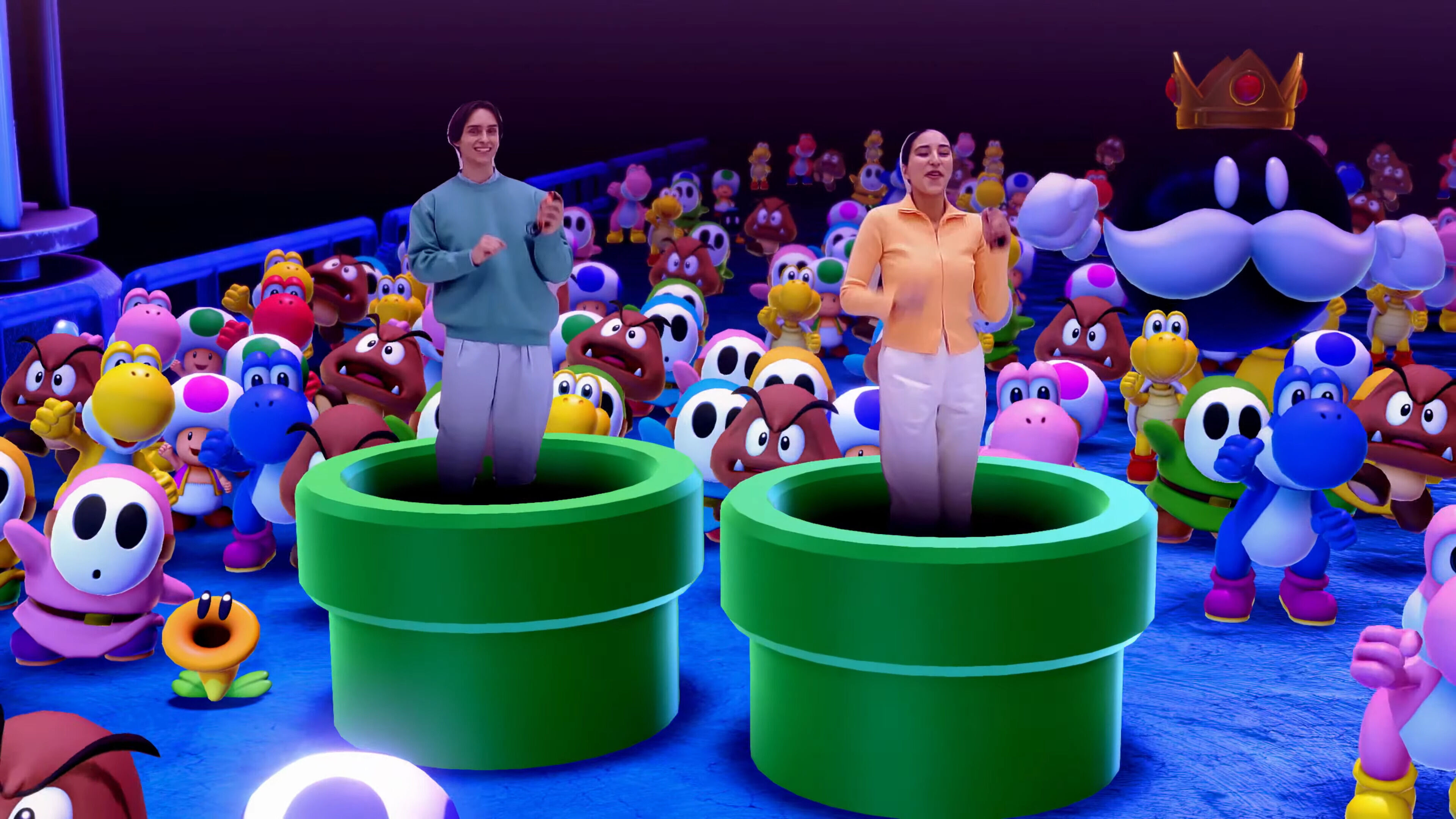 Luego debemos mencionar la ampliación y versión para Switch 2 de Super Mario Party Jamboree, que hace uso de un montón de características únicas de la consola, y más en particular de la nueva cámara que se pondrá a la venta por separado. Gracias a ello, nuestra imagen puede usarse durante el juego. En nuestro caso, durante el evento probamos el show de Bowser, un modo de lucha por equipos en que debíamos hacer cosas como golpear bloques o gritar agitando los brazos para contentar al archienemigo de Mario. Es muy divertido y único, especialmente si lo juegas con amigos.