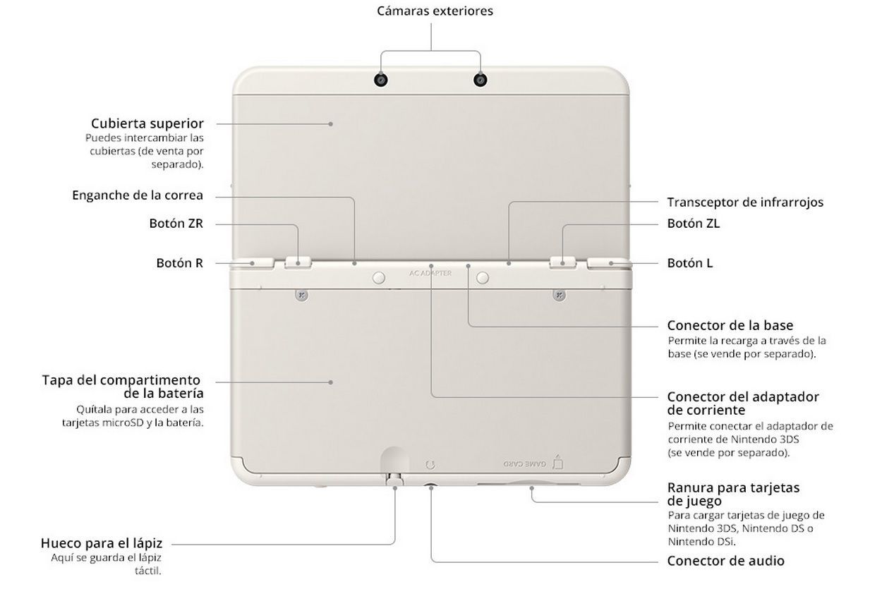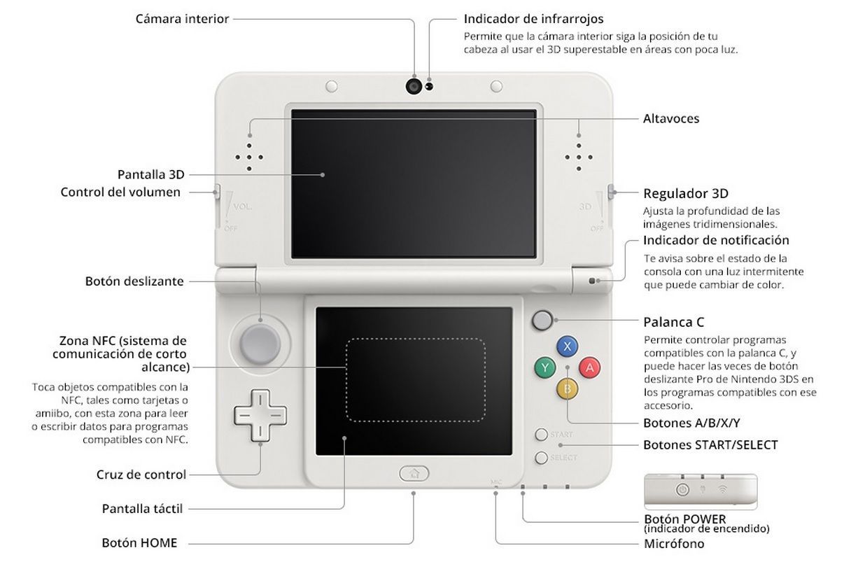 Entre sus mayores novedades encontramos dos nuevos botones superiores (ZR y ZL), la inclusión en la parte derecha de la palanca C, un stick un tanto peculiar que no se mueve y que principalmente se va a utilizar para mover la cámara en juegos tridimensionales, la tecnología NFC integrada, que permite la comunicación con las figuras amiibo, y un efecto 3D estereoscópico mejorado, mucho más estable, gracias a una nueva tecnología de seguimiento facial. Esta función, llamada 3D superestable, se puede activar y desactivar en el menú de opciones, y funciona gracias a un nuevo sensor de infrarrojos que en combinación con la cámara interior sigue el movimiento de nuestros ojos, lo que nos permite mover la cara o la consola sin perder calidad de imagen.