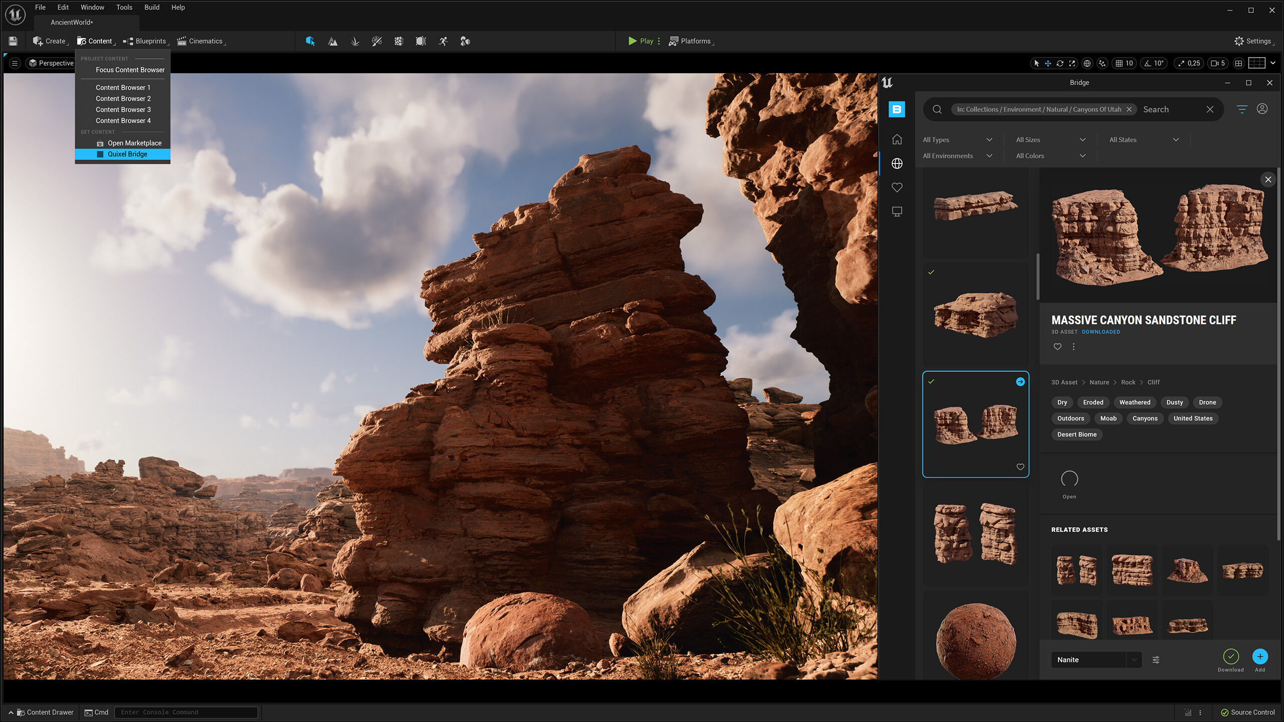 Pensando en el trabajo en equipo, la herramienta One File Per Actor permitirá a varios artistas trabajar la misma zona de forma simultánea, sin errores ni solapamientos. Este modo de editar incluye también un sistema de capas, para que se pueda editar una misma zona pero por ejemplo, alterada por algún evento, siendo esta visual una capa más del mismo área. Esta nueva versión de Unreal Engine cuenta con la integración de Quixel Bridge, un repositorio que alberga miles de assets para usar en el juego, haciendo más fácil el trabajo a los estudios más modestos.