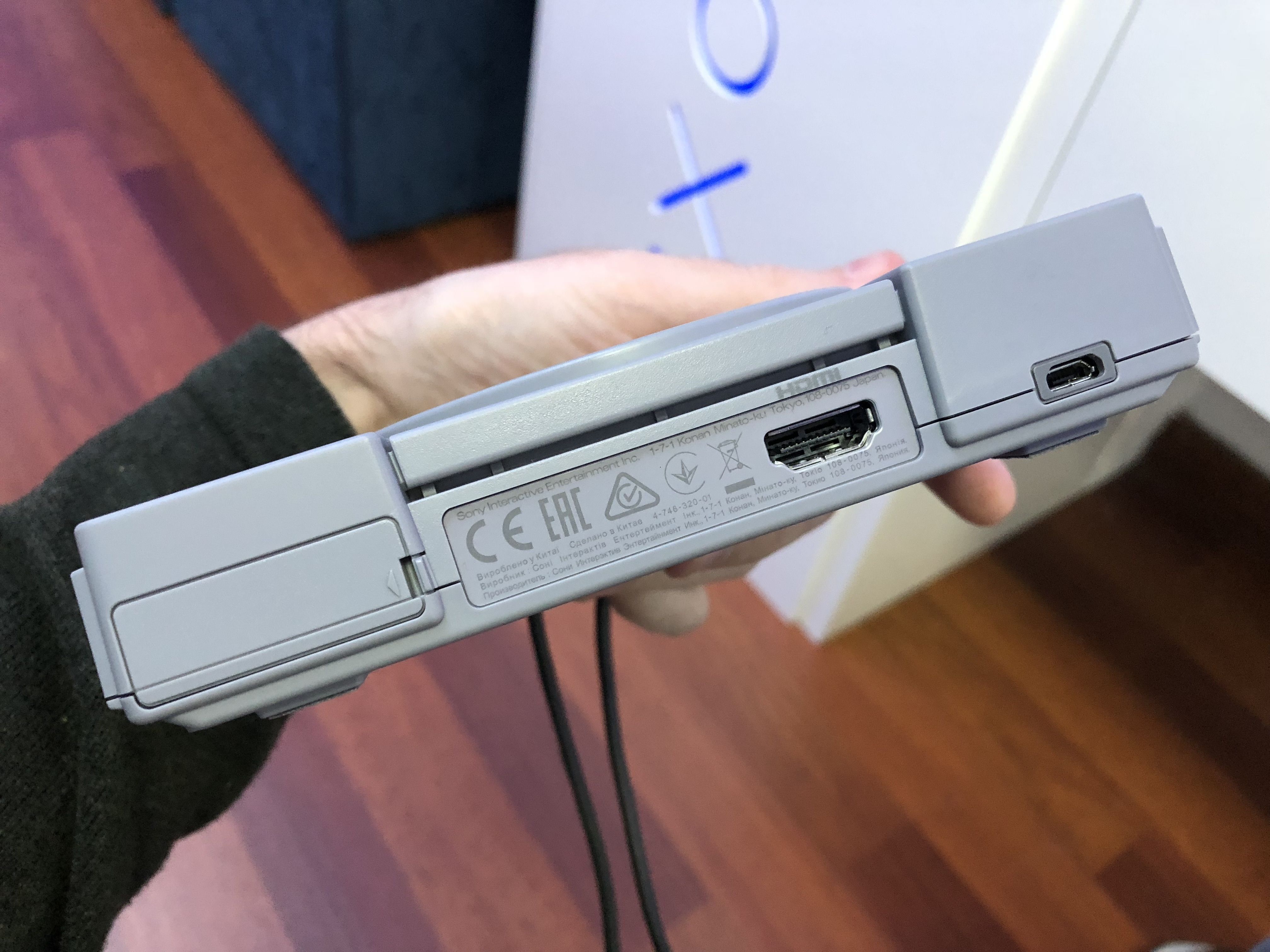 En la parte trasera tenemos el puerto de salida para el cable HDMI para enchufarlo a la pantalla correspondiente, y un puerto micro USB para alimentarla, conectando el cable que incluye ya sea a un puerto USB de la TV o utilizando un adaptador de corriente USB, ya que la consola no incluye adaptador de corriente. También hay una pequeña tapita de adorno que imita el puerto paralelo que incluía la PlayStation original (que no se utilizó demasiado, más allá de cartuchos de trucos Action Replay), y que no se puede abrir aunque mucha gente lo va a intentar para ver si esconde algo, como nos pasó a nosotros.