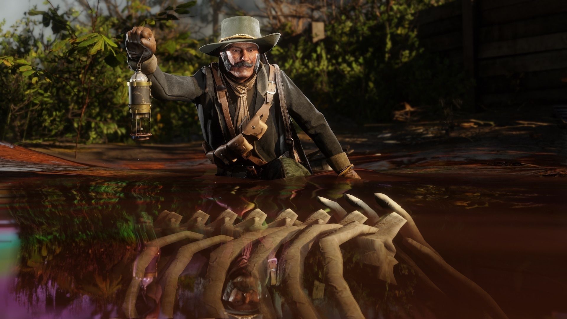 Hacer una de las misiones de naturalista puede dar situaciones tensas e hilarantes, sobre todo al jugar con amigos. En otra de nuestras partidas con representantes de Rockstar nos dispusimos a tomar muestras de un enorme caimán legendario que estaba acabando con demasiados animales en las zonas pantanosas cercanas a Saint Denis. Para pertrecharnos de recursos para la expedición, pusimos un campamento en plena naturaleza, una de las nuevas funcionalidades introducidas con la actualización". El campamento en la naturaleza era algo muy esperado y quisimos aprovechar esta actualización para incluirlo porque encajaba muy bien con la temática", comenta Katie Pica. Su compañero Butchard añade: "Poder instalarse en cualquier lugar de la naturaleza y hacerse un café o cocinar carne es un gran aporte que contribuye a mejorar la inmersión, y hace que te metas en el papel".