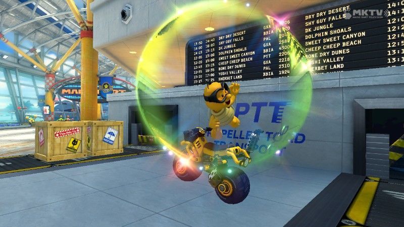 Nos vamos hasta Aeropuerto Soleado, uno de los nuevos niveles del juego que nos lleva hasta, sorpresa sorpresa, un aeropuerto soleado inspirado por Super Mario Sunshine. Cuando entramos en la terminal, pasaremos muy rápidamente por la cinta de las maletas, y justo arriba, vemos el panel con las salidas y las llegadas de los vuelos. ¿Que cuáles son los destinos? ¡Los propios circuitos del juego!