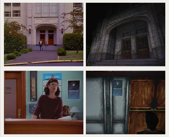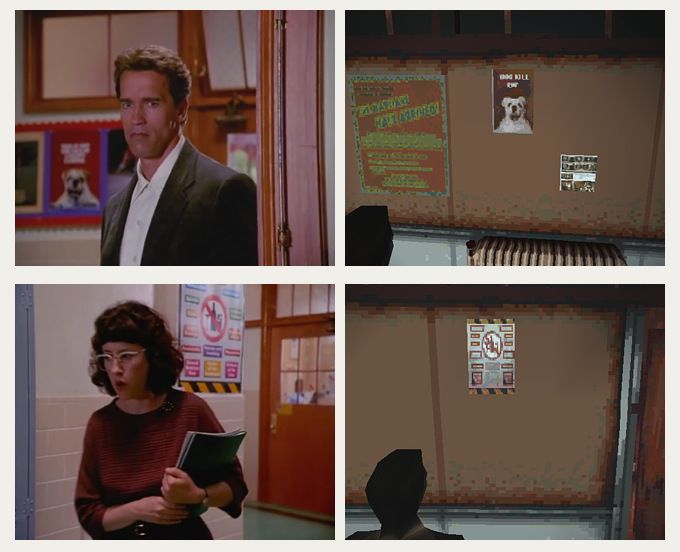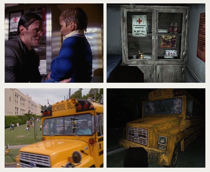 Y es que, aunque parezca una tontería, las escuelas japonesas –lugar de origen de los desarrolladores del juego– no tienen nada que ver, arquitectónicamente hablando, con las norteamericanas –lugar donde se desarrolla el juego–. Por esto, el equipo de Konami decidió tomar como referencia una escuela típica de Estados Unidos, y no tuvo mejor idea que elegir la de Poli de Guardería, película protagonizada por Arnold Schwarzenegger. Gracias a la web Silent Hill Heaven, tenemos una maravillosa comparativa, en la que podemos ver todas estas referencias en posters y otros pequeños detalles que delatan la inspiración.