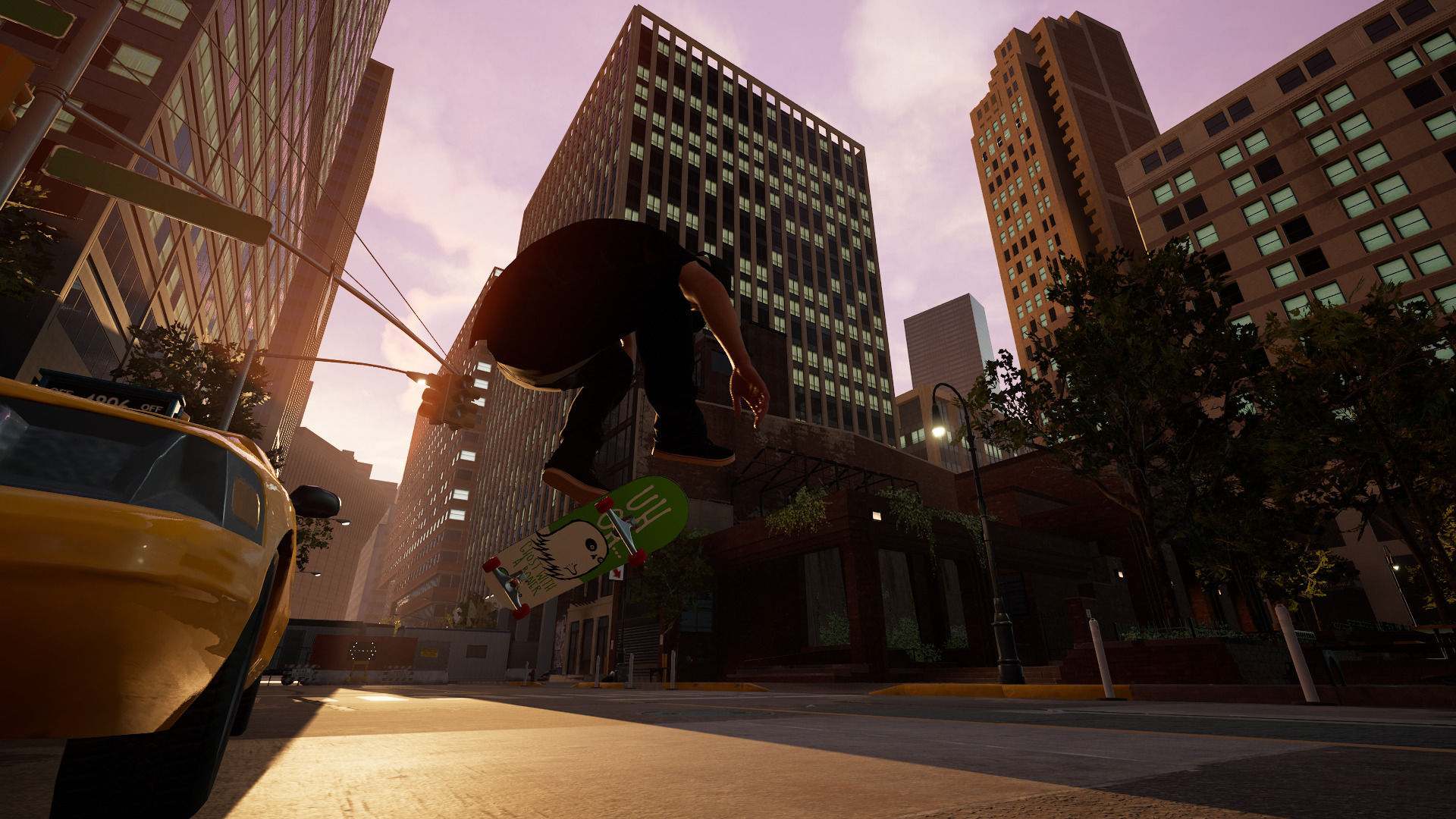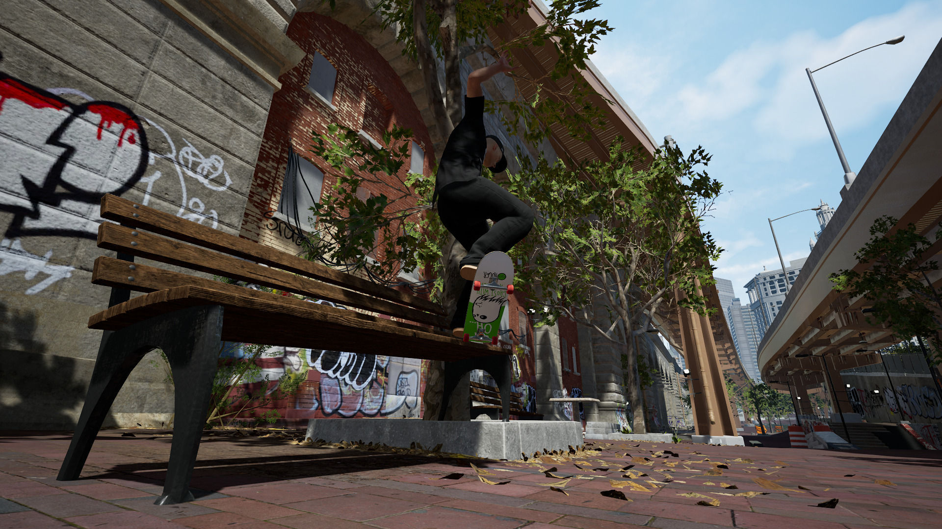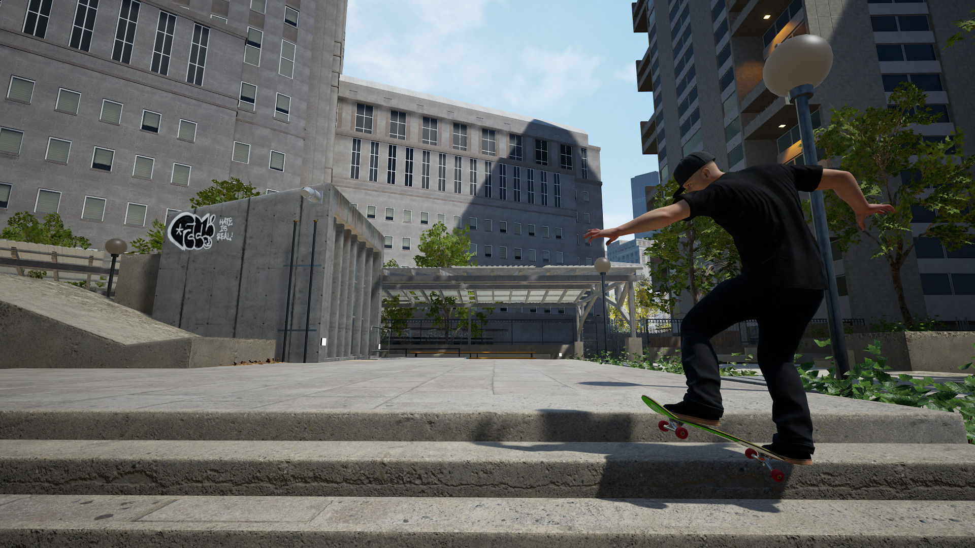Los grinds, por su parte, requieren colocar los pies en la posición del truco que queramos realizar. Para que os hagáis una idea, si saltamos sobre un raíl o bordillo sin mover ningún stick, el juego interpreta que tenemos las piernas «flojas» y nos caeremos. Tenemos que mover el pie frontal o trasero hacia el raíl, y en función del ángulo y cómo entremos conseguiremos un truco u otro. Esto nos da la posibilidad de modificar el truco según grindamos. Los grabs están presentes pero son un tanto experimentales por el momento. En este título podemos bajarnos de la tabla e incluso saltar para movernos por el escenario.
