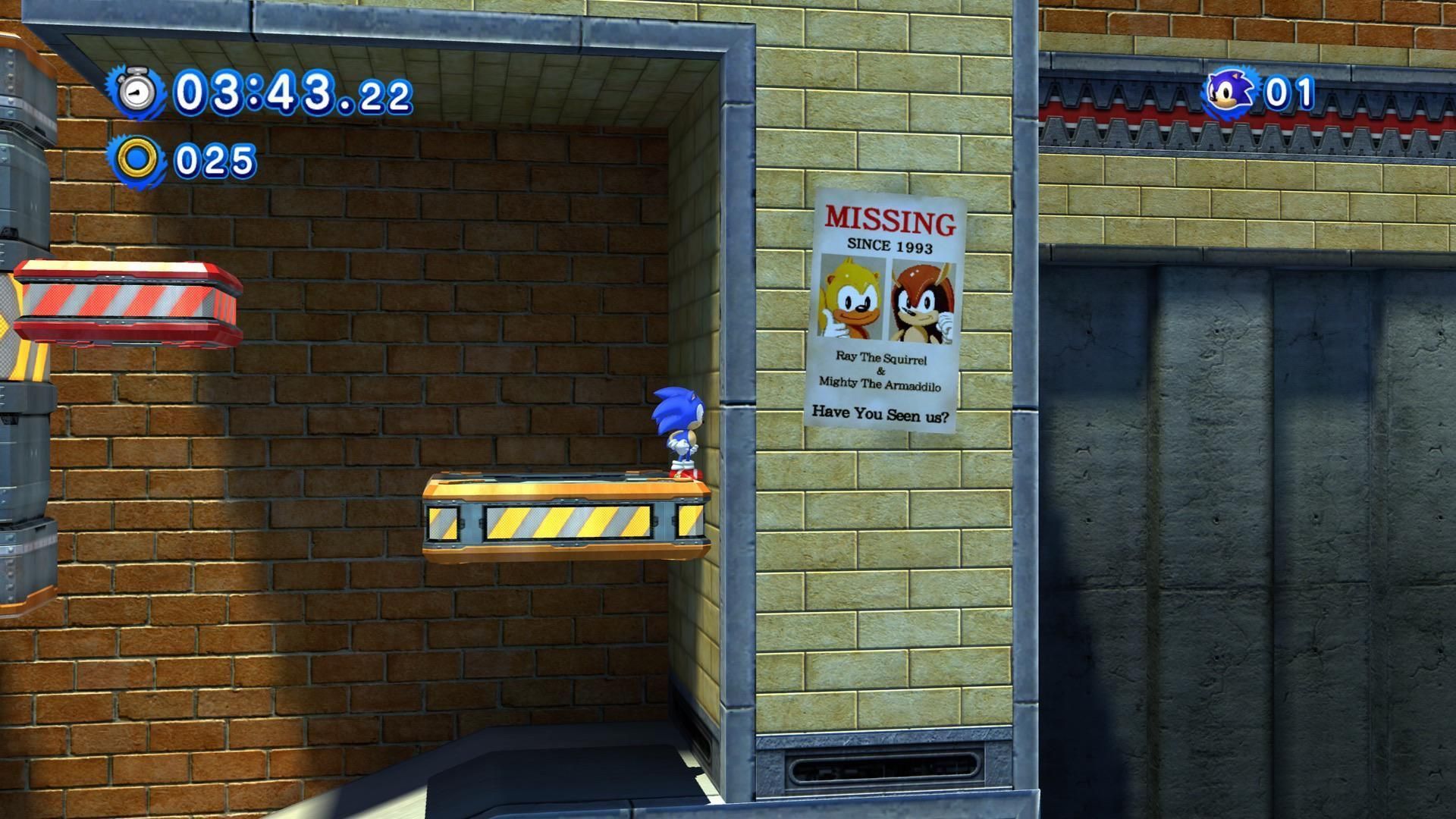 Sonic tiene más amigos que la mayoría de nosotros, pero dos de ellos, Ray The Squirrel y Mighty The Armadillo desaparecieron sin dejar rastro tras su aparición en SegaSonic the Hedgehog, una recreativa multijugador. En Sonic Generations podemos ver un cartel de «desaparecidos» que bromea con que no han aparecido en otro juego desde 1993. Eso sí, ambos se convirtieron en los nuevos protagonistas de Sonic Mania Plus, volviendo a unirse a Sonic 25 años después de su debut.