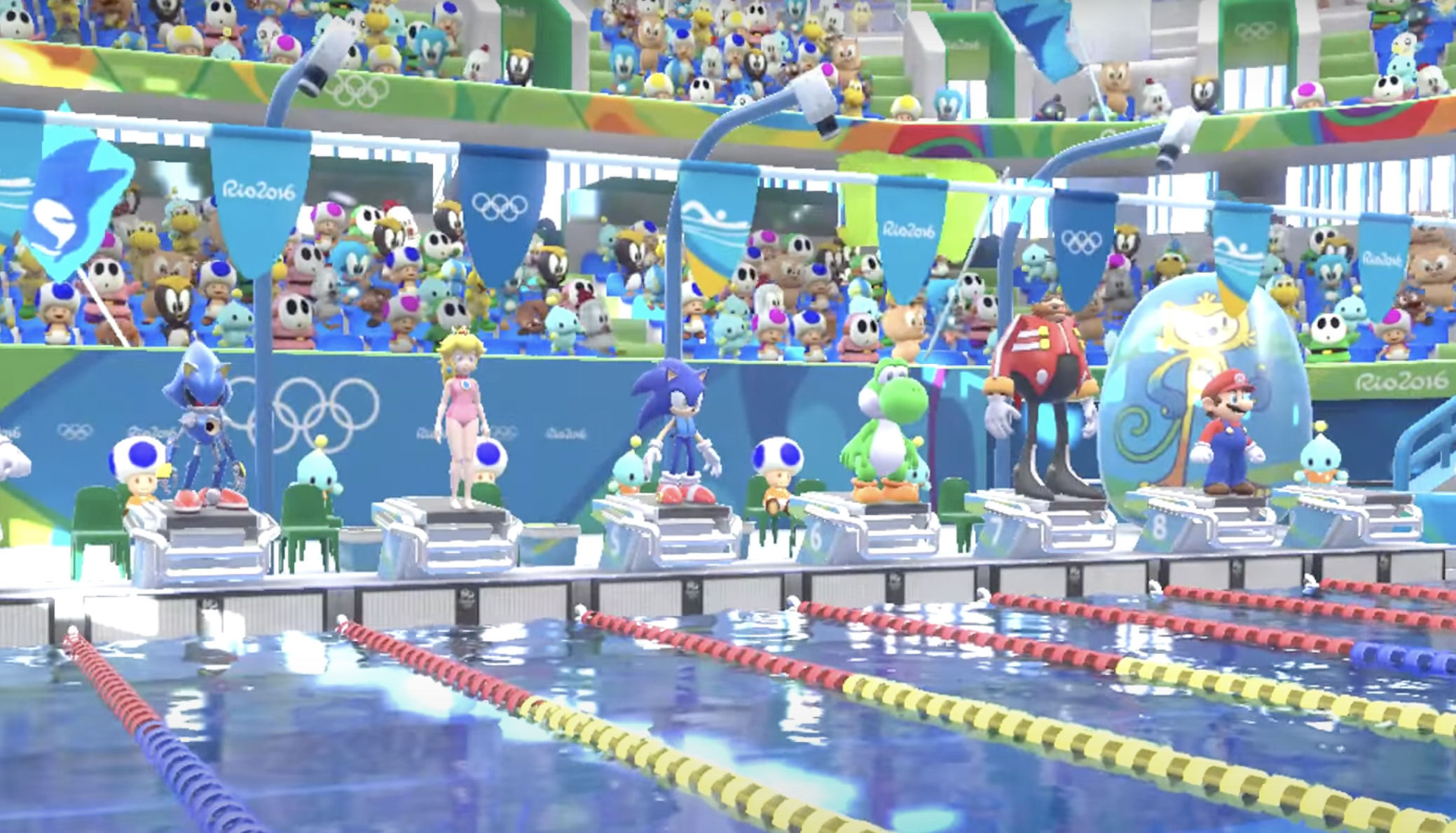 Sonic corre que da gusto, pero lo de nadar... no lo lleva tan bien. Quizás porque puede correr sobre el agua. Nunca lo sabremos. Lo interesante es que para evitar ahogarse, en Mario & Sonic en los Juegos Olímpicos: Rio 2016, Sonic lleva un chaleco salvavidas en las pruebas de natación que no llevan otros personajes. Suponemos que las piscinas olímpicas no tienen burbujas de oxígeno en el fondo.