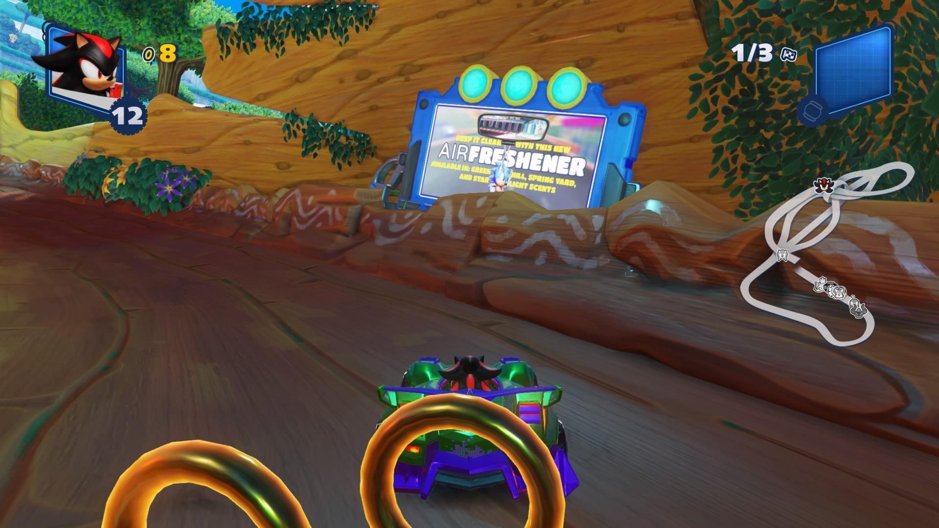 Cualquier fan de Sonic sabrá que su primera aparición oficial en un videojuego no fue en Sonic the Hedgehog, sino en Rad Mobile, un juego arcade de conducción, en forma de... ambientador de coche. En Team Sonic Racing, en las vallas del circuito, podemos ver publicidad de este ambientador. Hora de ir poniéndolo en la tienda oficial de Sega.