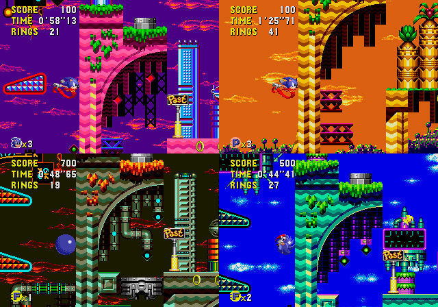Además, Ohshima incluyó una idea descartada de Sonic 2: los viajes en el tiempo. Le gustó poder tener un nivel y que cambiase a otra dimensión de manera fluida. Esto tuvo que ser cambiado cuando al programador principal, Matsuhide Mizoguhi, le tocó abordar el tema, porque no era posible tal cual en la máquina, así que se creó una pequeña secuencia de carga son Sonic flotando. Años más tarde, Ohshima lamentaría este cambio y comentó que si Naka hubiera sido el programador de Sonic CD, seguramente se habría podido encontrar una solución a este problema gracias a sus habilidades con el código y hacer lo que tenía en mente, algo similar a Regreso al Futuro, que corriendo sin pausa se pasa al otro tiempo.