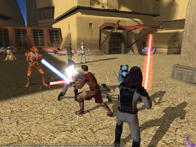 Esta vez, los combates con espadas se mejoran de una manera increíble. Kyle posee tres estilos diferentes de lucha que deberá ir cambiando para adaptarlo a las situaciones que se nos irán presentando. Habrá combates contra montones de Sith, soldados imperiales y como no, la chusma más característica de la saga Star Wars. Tampoco nos podemos olvidar de las batallas multijugador, que esta vez ganan una importancia vital con montones de modalidades de juego en las cuales, podremos poner a prueba nuestra pericia con los sables o con las armas de fuego, como prefiramos. Con el motor gráfico de Quake 3 como base, Raven crea unos entornos repletos de detalles y con mucha variedad. Los combates con sables de luz, como viene siendo habitual en la serie, son impresionantes. Siempre que iniciemos un combate veremos montones de destellos y fogonazos que iluminarán las estancias en las que nos encontremos. También impresiona la cantidad de enemigos que aparecen en pantalla.