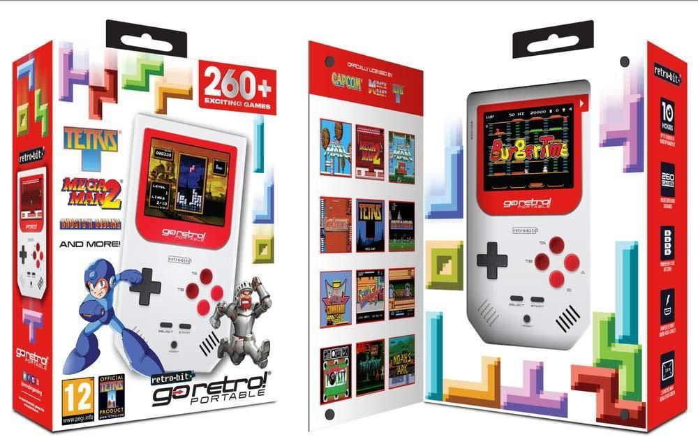 La GoRetro! Portable es una consola portátil. Esta consola que imita el diseño de la clásica Game Boy incluye 260 títulos clásicos, entre ellos algunos tan conocidos como Tetris, Mega Man 2, Ghosts n Goblins, Strider, Bad Dudes y Bionic Commando. Nos permite jugar durante más de 10 horas utilizando cuatro pilas AAA y su precio es muy ajustado, 39,99 euros.