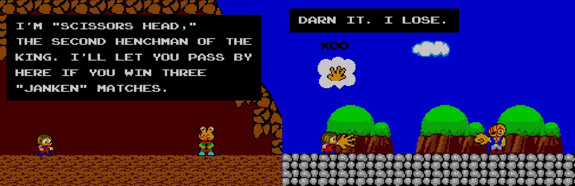 Pero sin duda, el aspecto más original del cartucho es el enfrentamiento contra los tres lugartenientes de Janken: Parplin el Perseguidor, Chokkina la Astuta y Gooseka la Resbaladiza (en serio, así son bautizados en el manual). En Miracle World los duelos se dirimen bajo las reglas del "piedra, papel o tijera" y es algo maravillosamente chiflado, aunque a veces te entren ganas de estrellar el mando contra la pared. Eso sí, si conseguías la "pelota telepática" podías ver en pantalla la jugada del rival, lo que facilitaba bastante los enfrentamientos.
