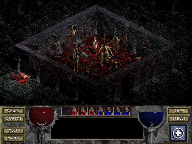 El sistema de equipo tampoco iba muy allá, con unos escasos huecos para equiparnos las distintas armas y armaduras que encontrásemos en nuestros viajes a las profundidades de Tristram. Todo esto se acabó traduciendo en una jugabilidad simple y directa que nos llevaría a reventar demonios a base de clics con unos controles y una cámara isométrica que serían replicados numerosas veces en el futuro por un sinfín de imitadores.