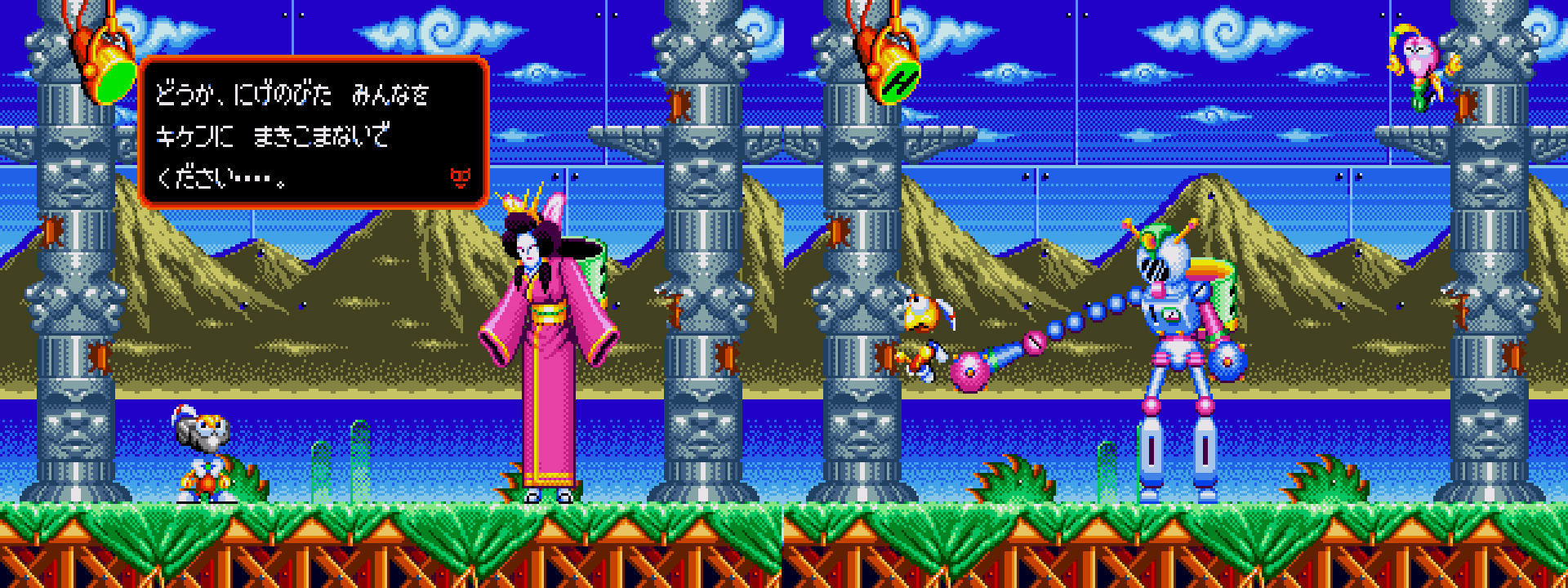 Más sangrante aún fue la eliminación de todos los diálogos que aparecían en el cartucho japonés, aunque afortunadamente es algo que se puede solucionar parcheando la ROM japonesa. En este enlace encontraréis el parche y cómo ejecutarlo. La ausencia de diálogo no afectaba a la jugabilidad, pero sí servía para explicar la historia de un juego tan delirante, en el que acababas protagonizando un segmento shooter dominado por un jefazo que iba mostrando las diferentes edades del hombre: niño, joven, adulto y viejete.