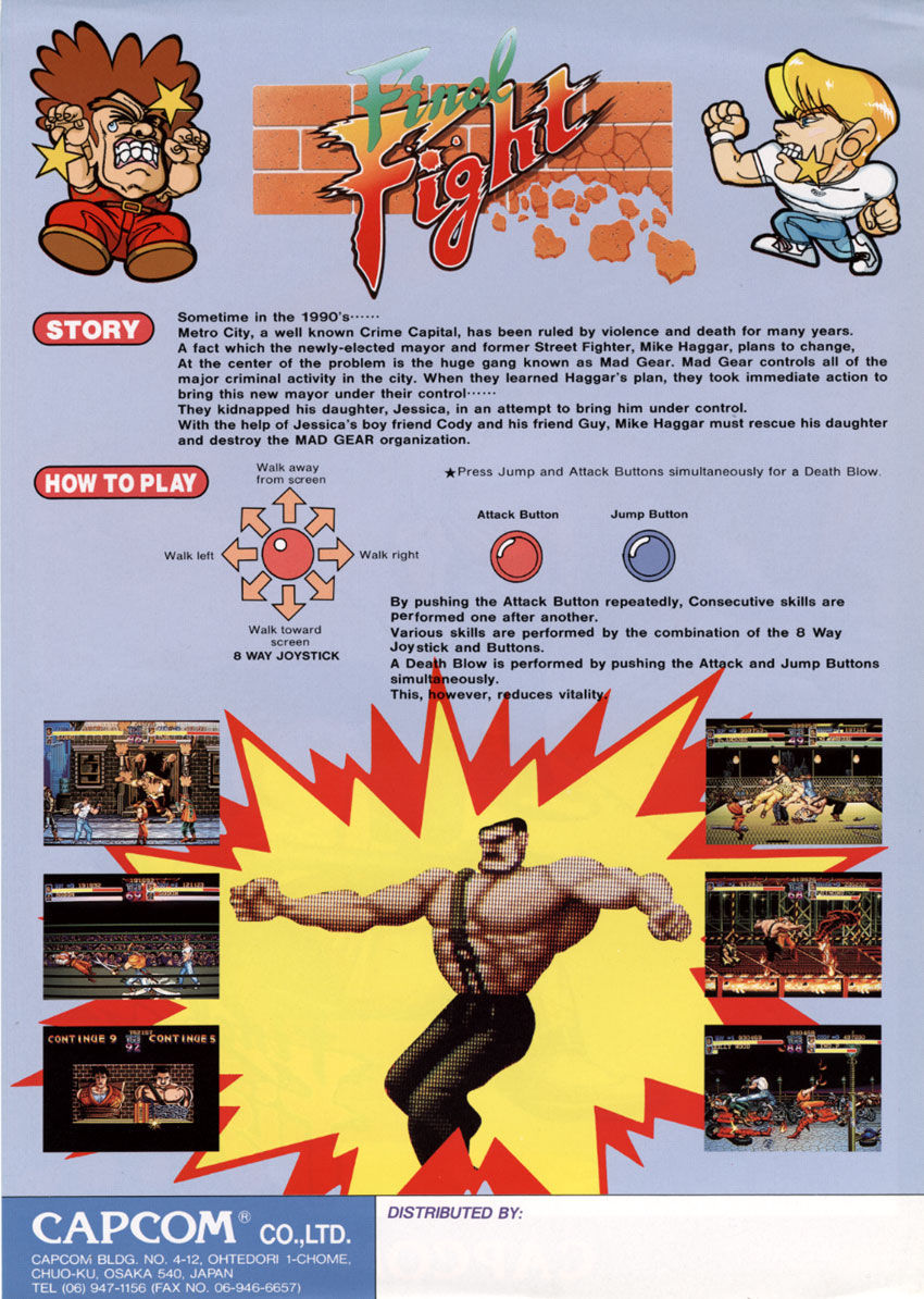 De hecho, Final Fight se iba a llamar originalmente Street Fighter’89, y con ese título fue anunciado en la prensa japonesa en marzo de 1989. Okamoto, Nishitani y Yasuda examinaron con precisión quirúrgica la fórmula Double Dragon, con la intención de crear el brawler más espectacular que su hubiera visto jamás en un salón recreativo hasta la fecha.