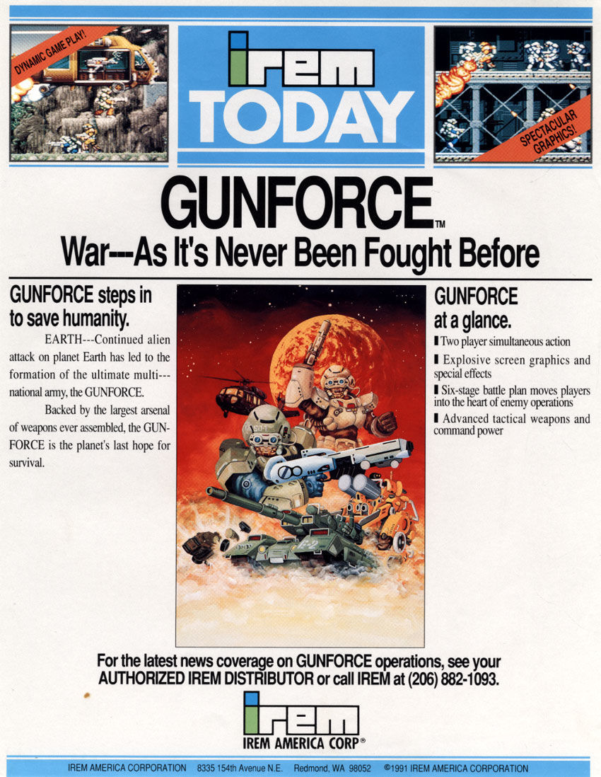 Corría el año 1991, cuando Irem lanzó GunForce, compañía de personal reducido, pero con una capacidad de producir excelentes videojuegos. En aquel año, cuando Super Nintendo y Mega Drive estaban en pleno apogeo, los arcades eran los que demostraban que el hardware en los hogares y en las salas recreativas aún tenían un margen insalvable.