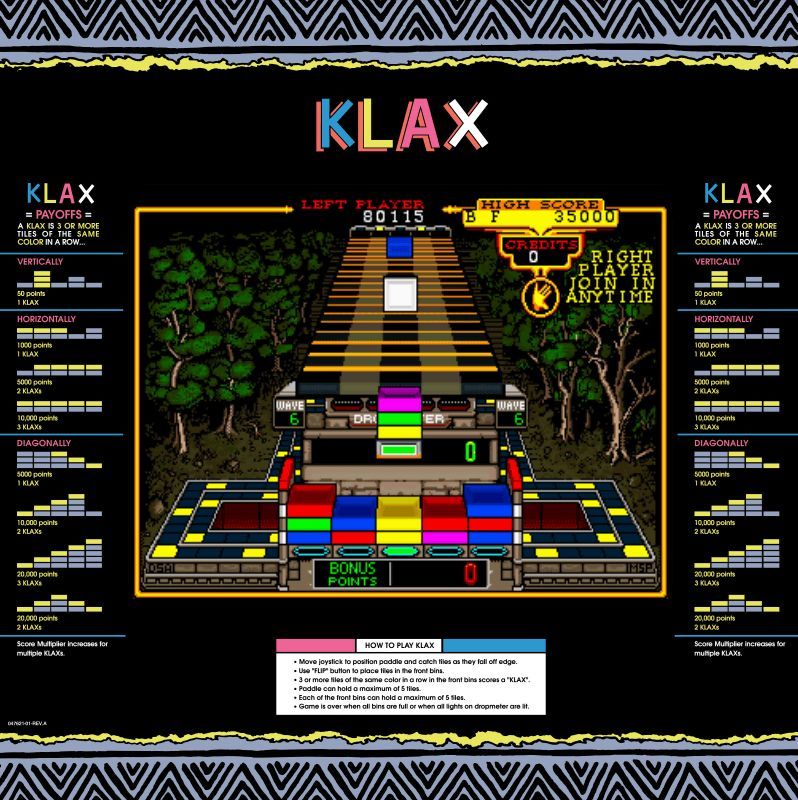 El clásico Tetris fue lanzado en el año 1984, y a pesar de convertirse en un éxito mundial, Atari Games pensó que debía haber una alternativa para quien no acabase de encajar bien las piezas en el juego del gran Alexey Pajitnov. Por ello, Marc Stephen Pierce y Dave Akers (creador de Burger Time, Star Strike y Bump´n Jump entre otros) decidieron que podían simplificar las acciones cómo girar piezas y crearon Klax, un videojuego de puzles diferente, y que por ello ofrecía una buena alternativa para quien se le atragantaban otro tipo de "videojuegos de pensar" como decía mi madre.