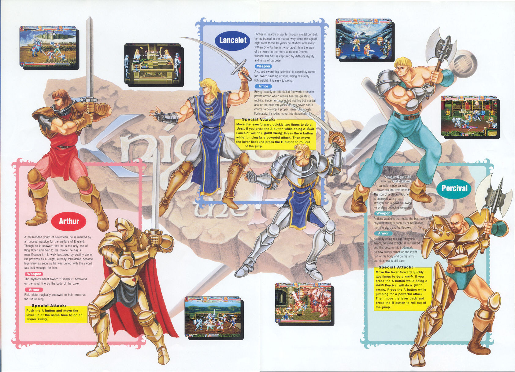 Como era norma en el género, cada uno de los tres personajes seleccionables diferían en cuanto a velocidad y ataque. Arturo era el personaje más equilibrado y contaba con la letal Excalibur como arma. El rubio Lancelot era más ágil pero su sable tenía el ataque más flojo, mientras que Percival era el Haggar del medievo: grande, lento pero enormemente poderoso, con un armamento pesado que evolucionaba del mazo al hacha.