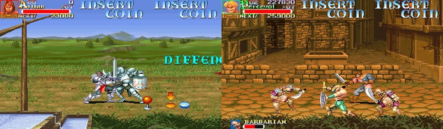 Aunque eran obra de la misma compañía, The King of Dragons y Knights of the Round rivalizaron en los recreativos, en pos de nuestras monedas de 25 pesetas, con una mecánica muy similar y tres jugadores simultáneos. El primero, ubicado en un mundo de fantasía plagado de dragones, orcos y demás fauna rolera, nos permitía elegir entre cinco personajes distintos (Mago, Elfo, Caballero, Clérigo y Enano). En cambio, Knighs of the Round nos ponía en el pellejo, acompañado de dos amigos, del mítico Rey Arturo y dos de sus más famosos Caballeros de la Mesa Redonda: Lancelot (Lanzarote) y Percival (Perceval).