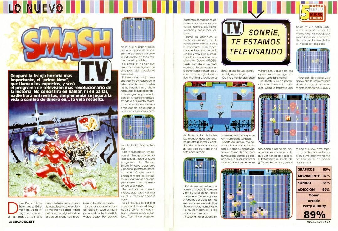 La acción de Smash T.V. era tan frenética como salvaje, aunque en todo momento Jarvis y su gente no dejaban que olvidásemos que todo formaba parte de un concurso de televisión. Al ir de un plató a otro podíamos ver las "tripas" del estudio, los cámaras filmando la carnicería y de vez en cuando aparecía en pantalla el presentador del show que, escoltado por dos azafatas, iba soltando una serie de frases digitalizadas que ya forman parte de la historia de los videojuegos. Desde un "Te la compro por un dólar" rescatado directamente de Robocop, pasando por el "¡Buena suerte, la necesitarás!" o la más inmortal de todas: "Big Money! Big Prizes! I Love It!"