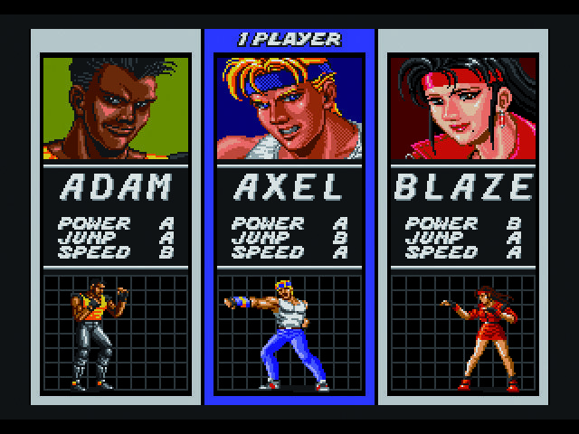 Uno de los grandes aciertos de Streets of Rage fue dotar a cada personaje de diferentes parámetros, que se notaban (y de qué manera) a la hora de jugar. Adam Hunter era lento pero demoledor (imposible olvidar aquel codazo), Axel Stone era rápido y contundente (pero tenía la capacidad de salto de un buzón de correos) y Blaze sacrificaba la potencia en los ataques para desplegar agilidad y un buen salto. De esta manera cada jugador podía seleccionar un personaje cortado a medida de su manera de jugar.