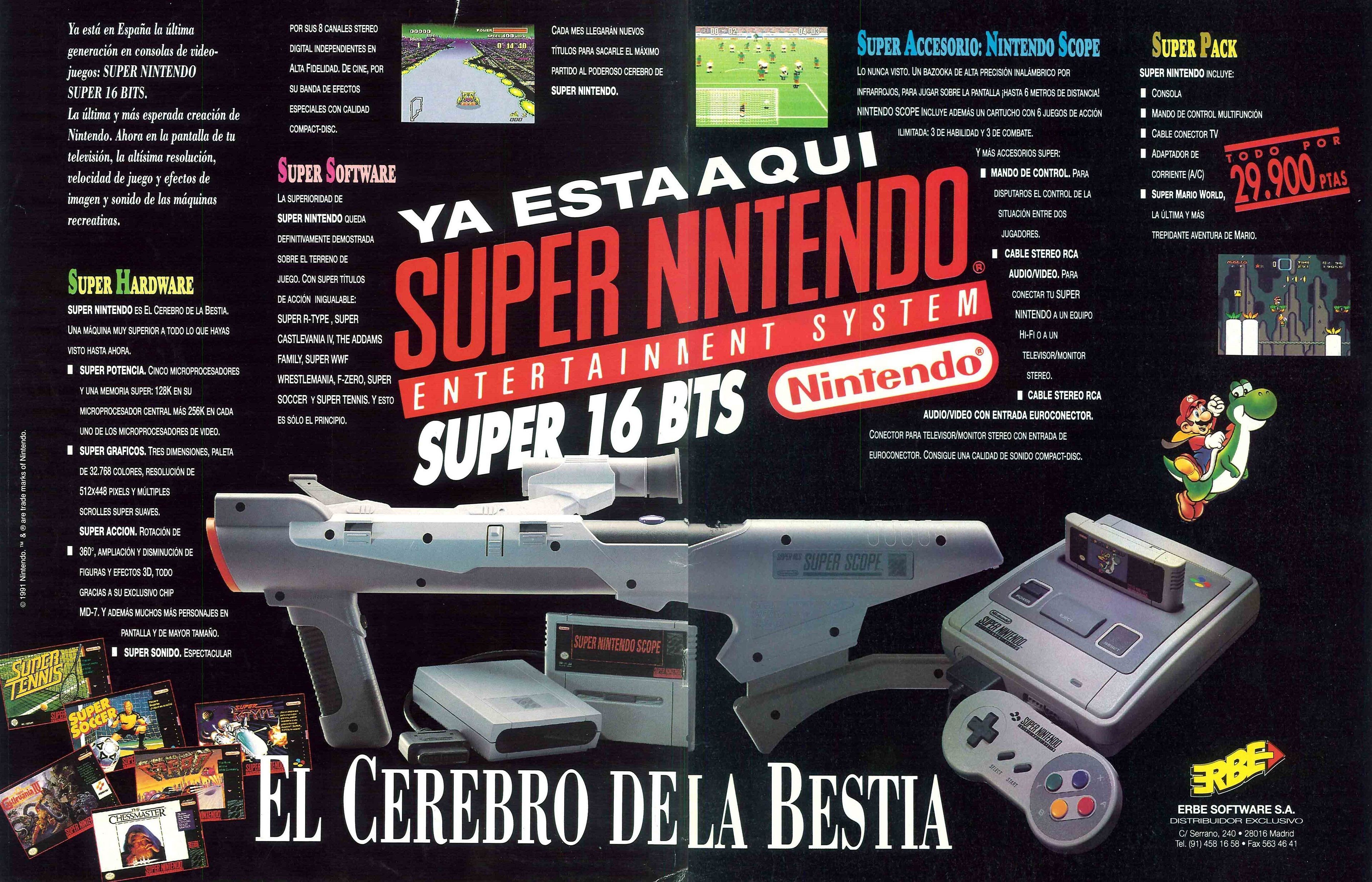 ¿Y en Europa? Super Nintendo desembarcó en el viejo continente en sucesivas oleadas. El Reino Unido fue la primera en recibir la consola, en abril de 1992. Luego le tocaría el turno a Alemania y posteriormente a España, concretamente en julio. La distribución de la SNES en nuestro país corrió a cargo de ERBE, el mayor distribuidor de videojuegos del país, quien ya se encargaba por entonces de comercializar aquí la Game Boy. Por 29.000 pesetas (174 euros), pudimos llevarnos a casa "el cerebro de la bestia" con el Super Mario World de regalo. Para la historia quedó aquel mítico VHS que se regaló con la revista Hobby Consolas, en el que nos mostraron la consola en toda su gloria, en aquellos tiempos pre-Youtube.
