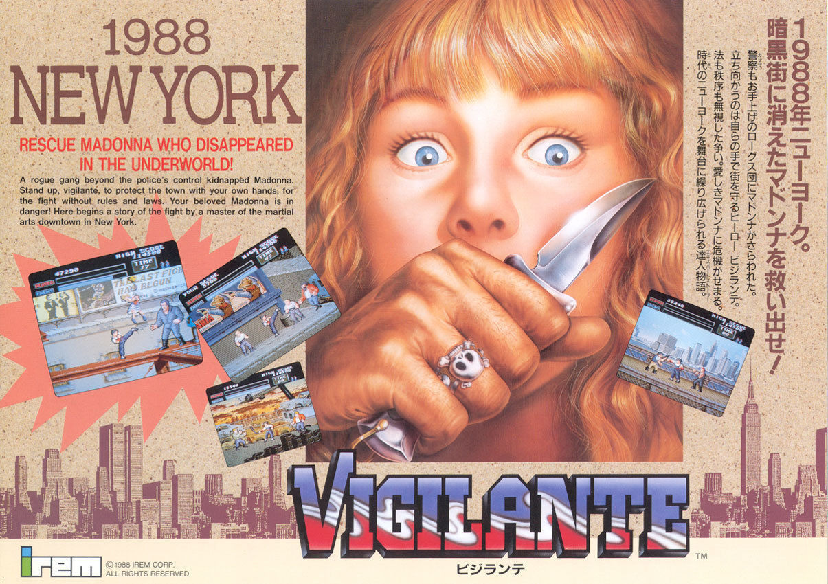Con la promesa de retomar en un futuro próximo el tema Kung-Fu Master (no es para menos, fue diseñado por Takashi Nishiyama, el posterior director de Street Fighter y Fatal Fury) nos despedimos de nuestro amigo el justiciero, la pobre Madonna y los cansinos Skinheads. ¿Alguno llegó a jugar en el bar de su barrio con la recreativa de Vigilante? ¿Y con las versiones para ordenadores domésticos? ¿Podéis creer que llegué a ver en un Corte Inglés el port de TG-16 con un precio de 95 pesetas? Como siempre esperamos vuestros comentarios y anécdotas.