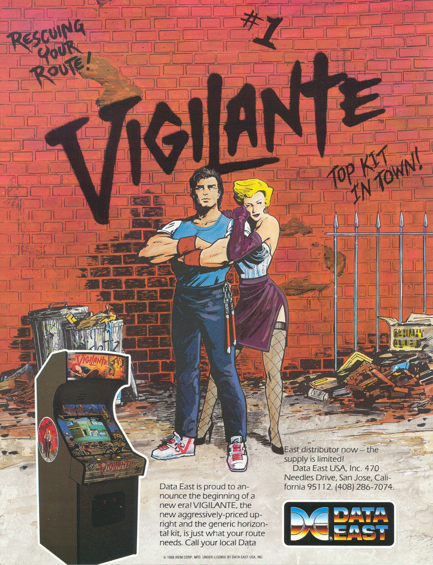 Vigilante debutó en los salones recreativos japoneses en marzo de 1988 y Data East obtuvo la licencia para explotar la máquina en Occidente, obteniendo un éxito considerable que, por supuesto, se tradujo en un aluvión de adaptaciones domésticas.