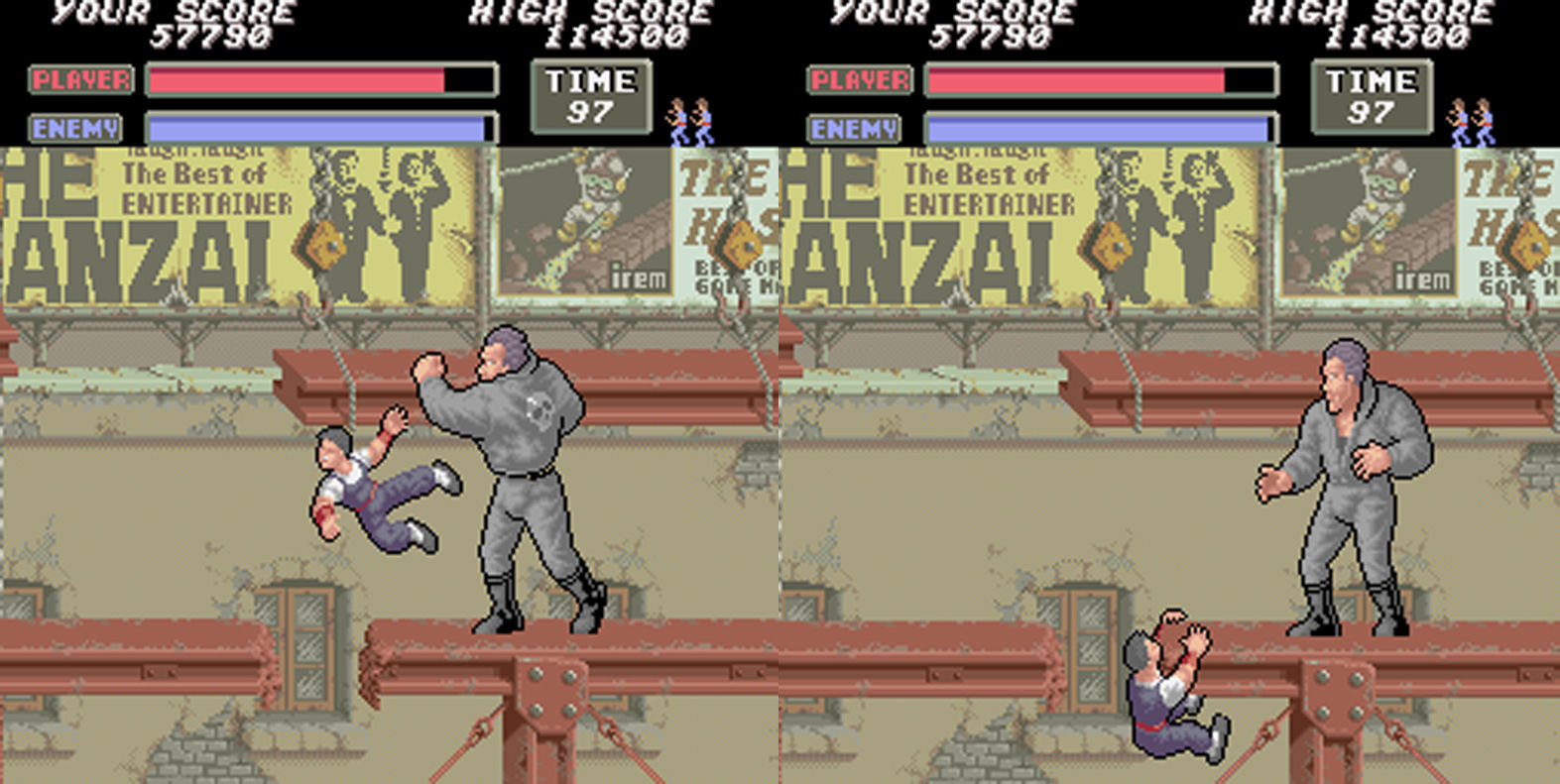 A diferencia del arcade de Technos, aquí no había un segundo de respiro. Los Skinheads no dejaban de aparecer en ambos márgenes de la pantalla e incluso, en uno de los últimos niveles, trepaban desde abajo para enganchar las piernas de nuestro personaje, lo que nos obligaba a realizar saltos y barridos para no perder la barra de vida a velocidad de vértigo.