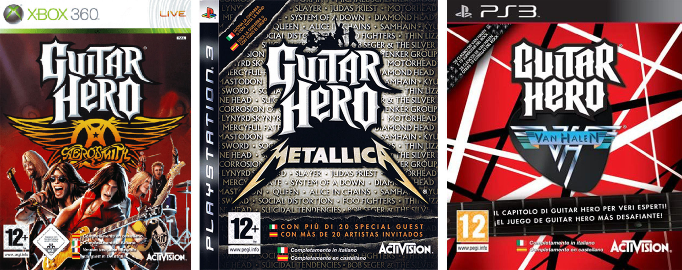 Guitar Hero salió al mercado en 2005 para PlayStation 2 en un acuerdo con RedOctane, trasladando la idea que había cultivado en Japón la saga GuitarFreaks de Konami / Bemani. La baza principal era venderlo junto a una guitarra como mando —RedOctane era fabricante de periféricos y sería también el publisher del juego—, un modelo idéntico a una Gibson SG pero con 5 botones de colores en lugar de los 3 botones que utilizaba Konami en sus títulos. Esta primera entrega tiraba ligeramente más hacia el punk, aunque con un generoso listado de clásicos del rock con bandas como Joan Jett & The Blackhearts, ZZ Top, Blue Öyster Cult o Black Sabbath, siendo algunas de las canciones más recordadas del set el «Spanish Castle Magic» de Jimi Hendrix o el «Crossroads» de Cream.