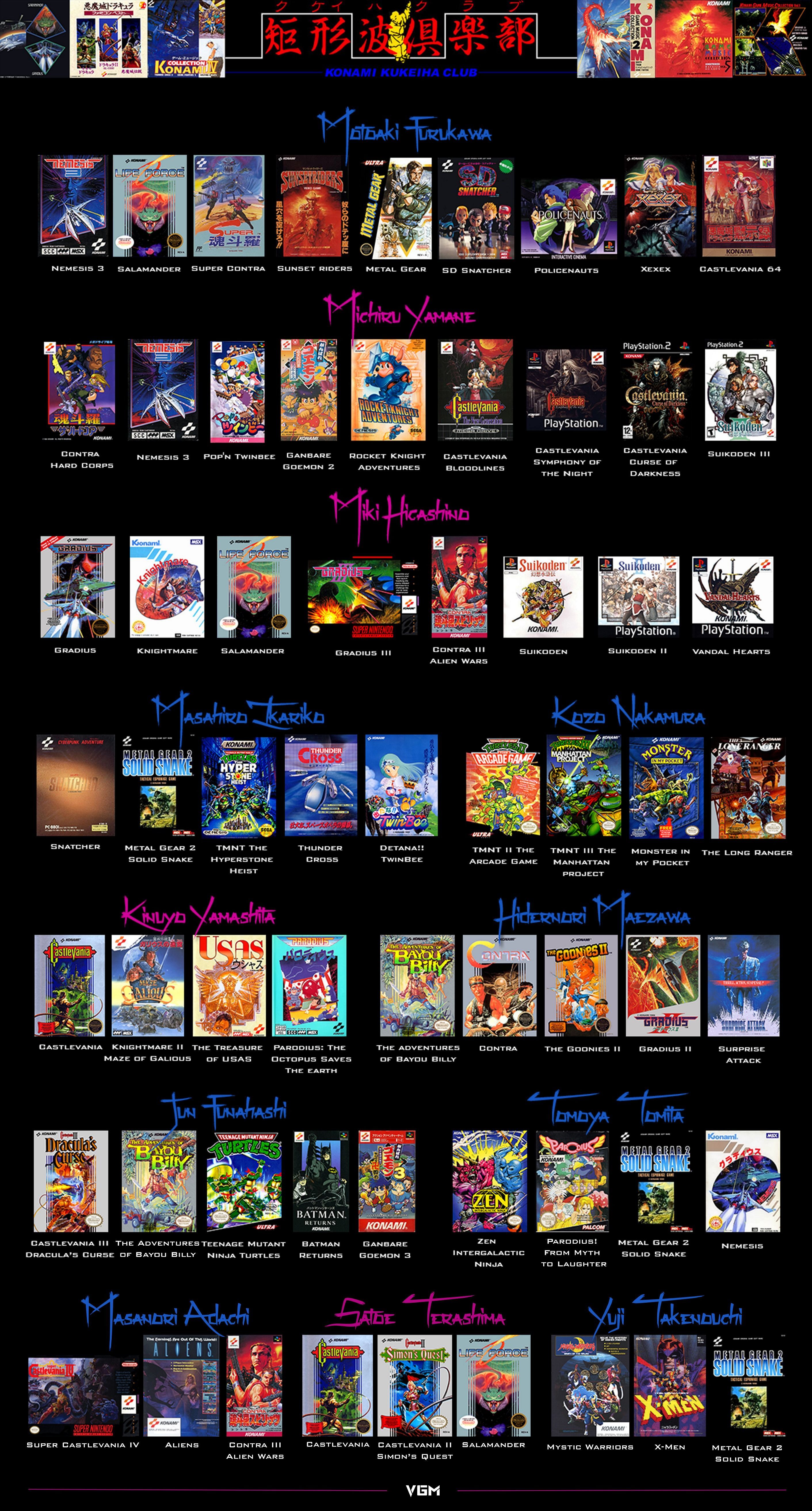 Resulta muy difícil encontrar juegos de Konami en los que se encargase una única persona del sonido, por lo que debemos tener en cuenta que aun habiendo elegido a los más prolíficos o importantes, muchos de los juegos por los que se les conoce los hicieron con otros integrantes que bien colaboraron en otros temas, programaron audio o hicieron efectos. Esta es la razón principal por la que los nombres se diluyen entre tanto título.